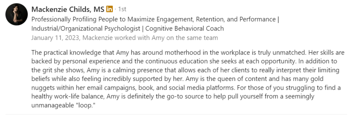 “I came to Amy during a season when I felt so much corporate burnout while I was juggling my executive sales role raising 3 boys. I'm a big fan of positive psychology, high performance and wellness but Amy had a way of going even deeper to help me eliminate the root causes of chronic stress. She helped me grow in my leadership and also launch my first business, creating over $50k in my first event. I love that we could bridge healing and personal development with business growth."